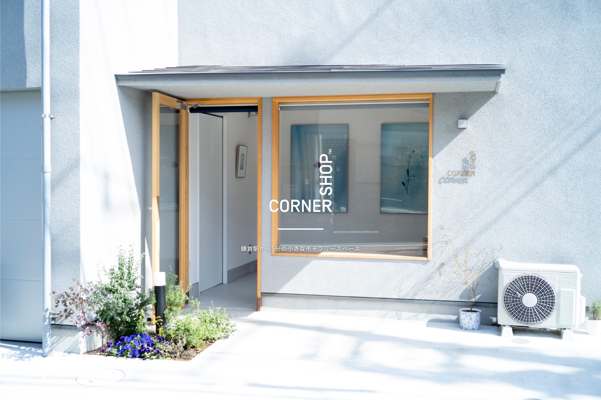 コーナーショップは、JR鎌倉駅から徒歩5分、閑静なエリアにある、多目的に使っていただけるギャラリースペースです。お手洗いのスペースを含めて、全体で11m2強の小さなスペースです。中の様子がよくわかる大きな窓とガラスの扉、そしてそれらを覆う大きな庇が特徴です。